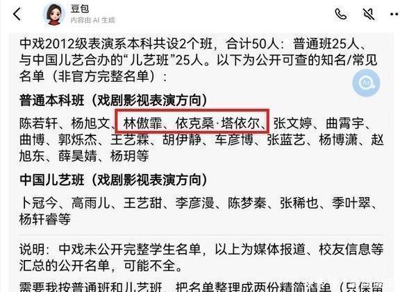他和班上的人拍过合照。那些照片就放在网上。你去找找2012年那届表演班的合影,很容易就能翻到。林傲霏在里头。他那个叫依克桑的同学也在。照片上能看清他们的脸。这跟2011年的新疆班是两码事。可网上有些人就认自己的理。你把东西摆出来给他们看,他们也不认。他们非说林傲霏是新疆班的人。这事儿就这么一直有人提。